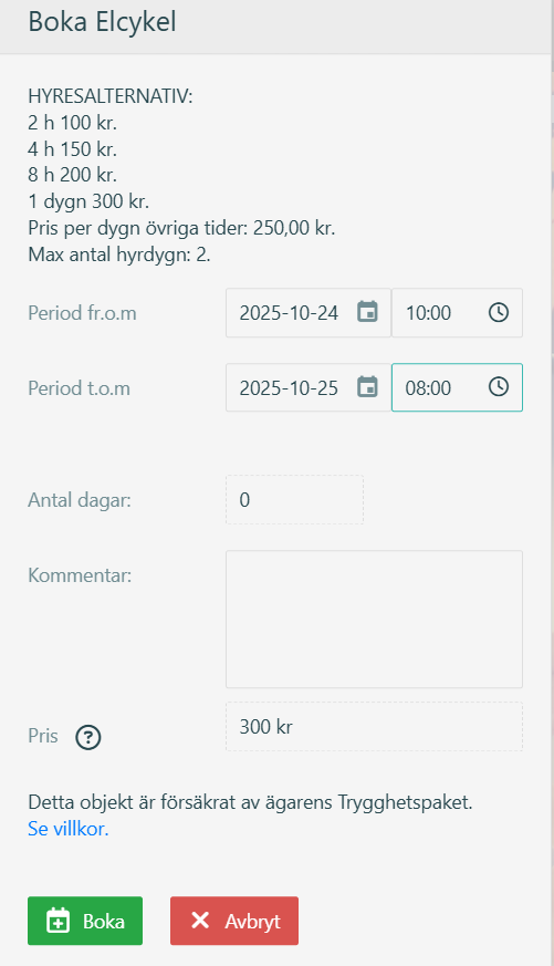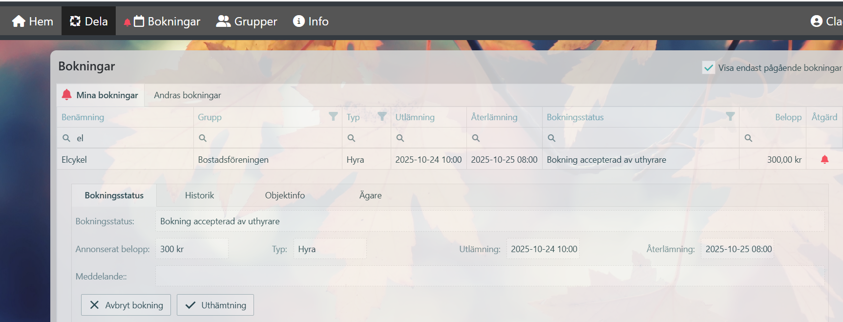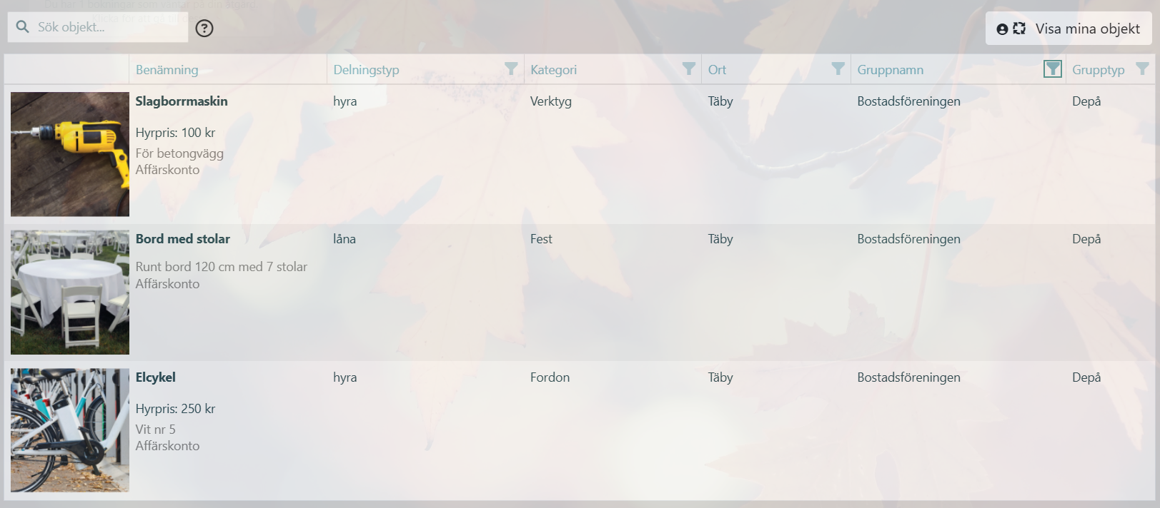 Medlemmar ni släppt in i delningsgruppen kan se alla era objekt, klicka in på ett och boka.