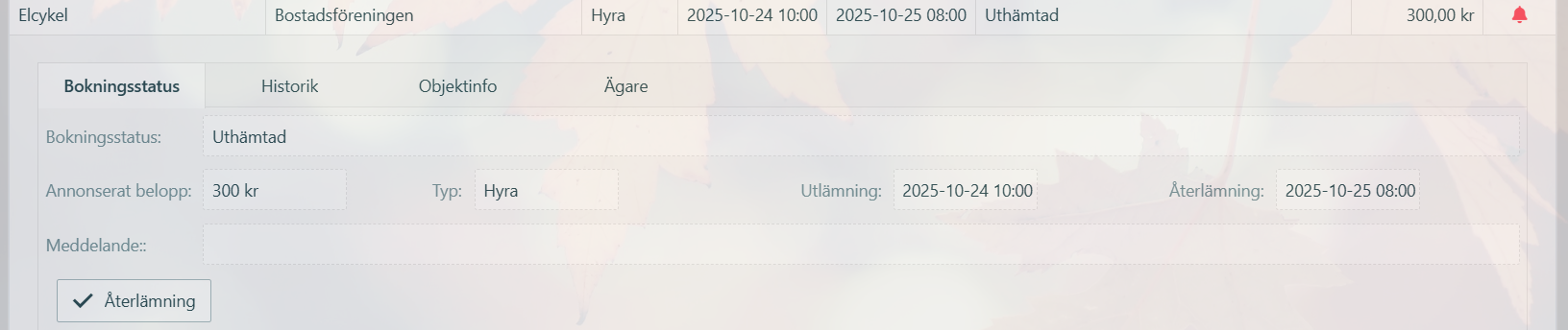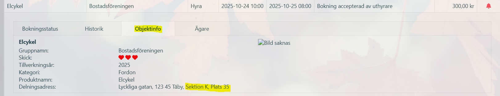 När det är dags hämtar medlemmen objektet i förrådet. Platsen visas under objektinfo i bokningen.